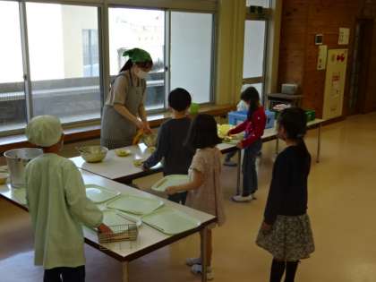 給食の準備(2年2組)