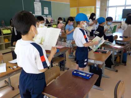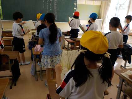 国語で「ふきのとう」を学習しています。誰のせりふなのかを確認し、役になりきって音読しました。役により近づくために、どのように音読したらよいか、考えていきたいですね。