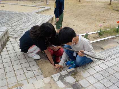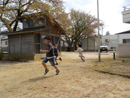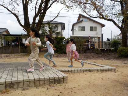 2年生の休み時間の様子です。天気の良い日には、なかよし広場で遊んでいます。クラス関係なく、みんなで体を動かしています。元気いっぱいの2年生です。