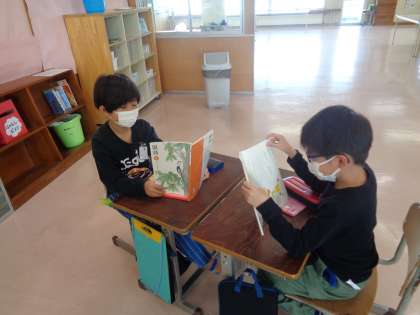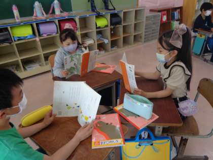 今日の国語は、「どきん」という詩を音読しました。「『どきん』てどういうことだろう」「だれがどきんとしたんだろう」などと考えながら工夫して音読することができました。