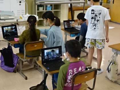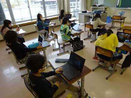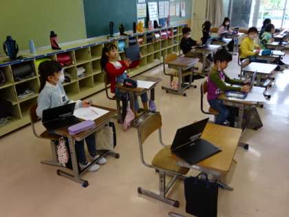 クロームブックで自分の顔をうつし、参考にしながら描いています。
