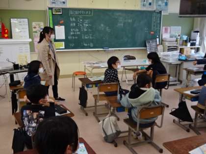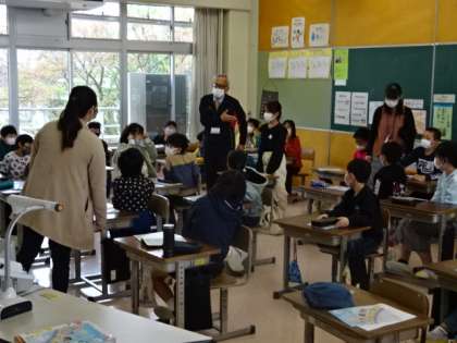 英語専科の橋本先生、ALTのクリスティーン先生と初めての外国語活動です。