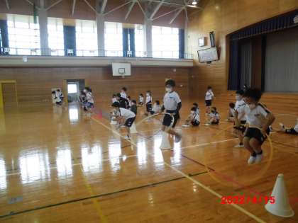 先生の指示のもと、いろいろなスタートから走る練習をしました。最後には新聞紙を使って、友達と息を合わせてボール運びをしました。