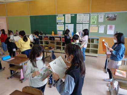 国語の学習で、きつつきの商売を音読しました。ペアの人と交代読みをしました。長い文章でしたが、集中して気持ちをこめながら音読することができました。