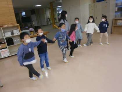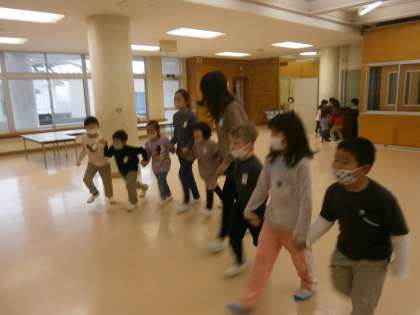 休み時間に6年生が一緒に遊んでくれます。楽しそうに花いちもんめをしていました。