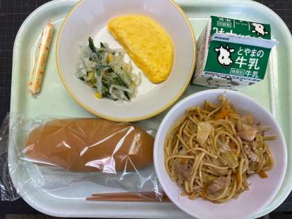 【献 立】 コッペパン、牛乳 オムレツ えごまドレッシングサラダ 焼きそば 棒チーズ