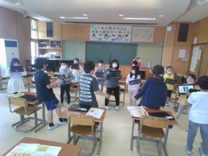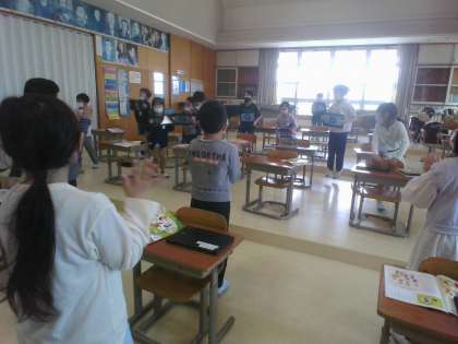 「子犬のビンゴ」を学習しました。アルファベットに合わせて手拍子したり、ジャンプしたりして楽しく歌っています。