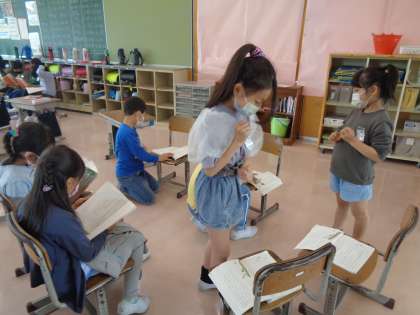今日は、各グループに分かれて音読劇の練習をしました。声の大きさや間の取り方、動きなど工夫がたくさん見られました。最後は動画に撮って確認している様子も見られました。