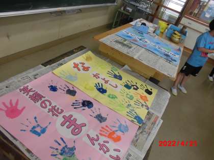 一人一人自分の手のひらに好きな色の絵の具を塗って、目標を華やかにしました。