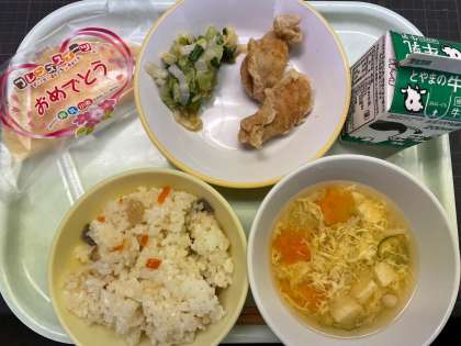 ※今日は入学おめでとうメニューでした。かきたま汁の中に、☆の形をしたスペシャルにんじんを発見しました。1年生が入学してもうすぐ1か月、あっという間ですね。学校生活にも慣れ、みんな元気に過ごしています。