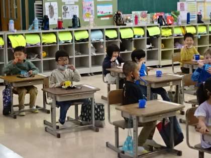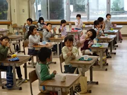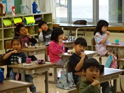 給食の時間の最後には、きれいに歯みがきをしています。