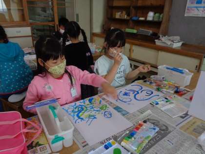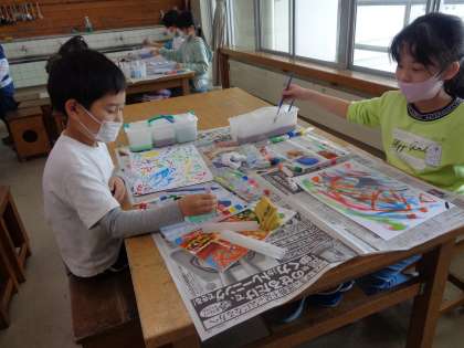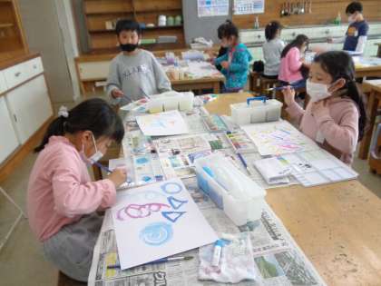 今日の図工は、水彩を使ってクラッカーの絵を描きました。筆の力加減や水の量等によって、見え方が違っておもしろいですね。