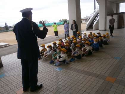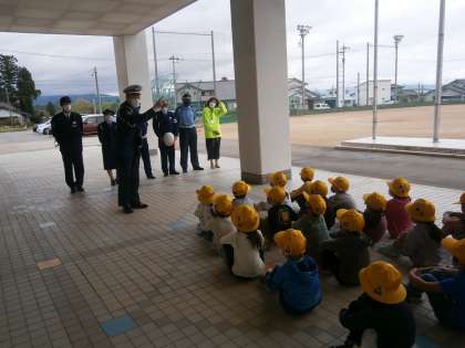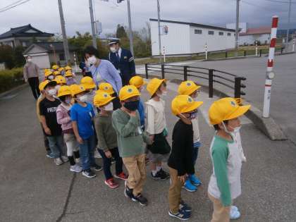 警察官や交通指導員の方々に見守られながら、交通ルールや道路の歩き方を学習しました。田畠方面へ歩いていき、踏切や横断歩道を渡るときの注意事項をよく聞いて、安全に渡れるよう練習しました。