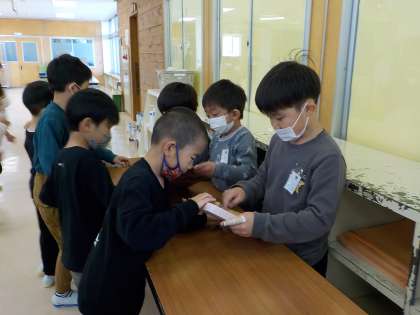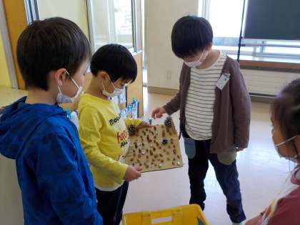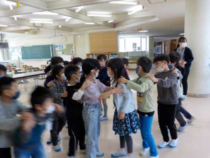 1年生と2年生が交流しました。2年生が去年作ったおもちゃで遊んだり、ハンカチお年やじゃんけん列車で遊んだりして、仲を深めました。1年生は、2年生と遊べたことがとても嬉しかったようです。2年生は、みんなで仲良く遊ぶことができ、達成感を感じていました。これからも、様々な面で交流していきたいですね。