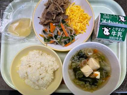 【献 立】 ごはん(ビビンバ)、牛乳 焼き肉・ナムル・錦糸卵(ビビンバ) 中華スープ 冷凍りんご