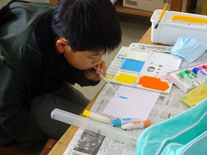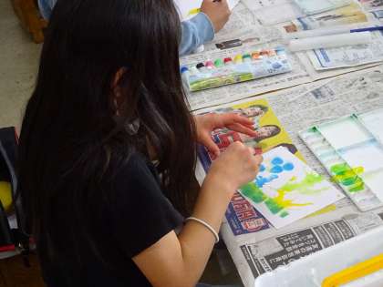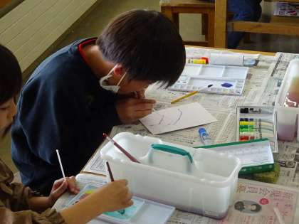 筆で塗るのではなく、絵の具をたらしたり、ストローで風を送ったり、色んなもので押したりして世界に一つだけの模様をつくります。