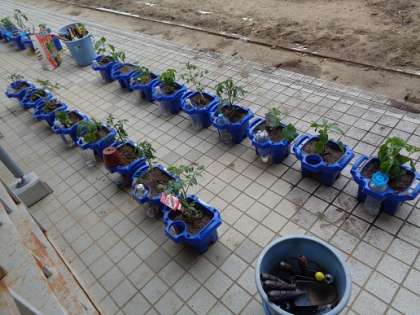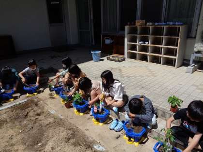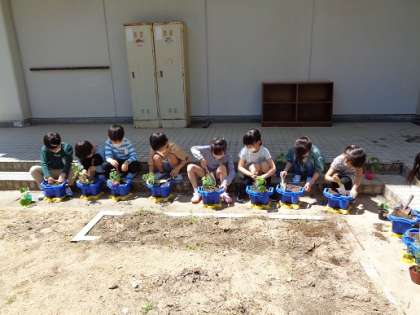 今日は野菜の苗を植えました。早く大きくならないかな、うまく育ってくれるかな、と野菜を育てることにわくわくしている様子でした。