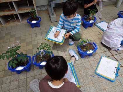 自分の植えた野菜の観察をしました。葉の形や、さわってみるとざらざらしていたなど、細かいところまでよく見て観察していました。