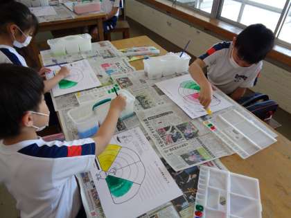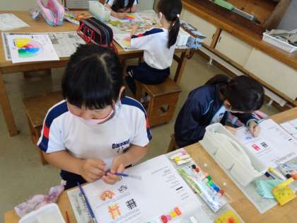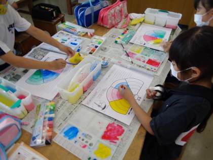 絵の具を使って、水をうすめて色を変化させたり、いろんな線を書いたりして表現の幅が広がるように練習しました。水の加減に苦戦する子供たちでしたが、カラフルな羽の感じを表現することができました。絵の具の使い方はばっちりですね。