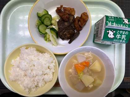 【献 立】 ごはん、牛乳 豚肉とレバーの揚げからめ きざみ和え ごまけんちん