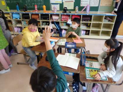 国語の時間に、伝えたいことを伝え合いました。今回は、友達の話を聞いて、知りたいことを質問したり心に残ったことを伝えたりすることが目標です。友達の話をよく聞いて、たくさん質問したり感想を伝えたりすることができました。