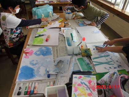今日の図工では、これまでの授業でできた作品を使って大きな作品を作りました。