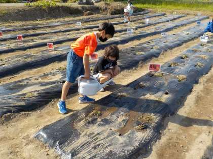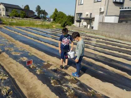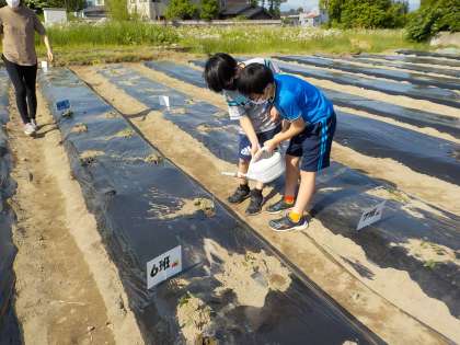 ファミリー班の2年生といっしょに、さつまいもの水やりをしました。2年生に優しく声をかけ、一緒に水をあげている姿は、さすが上学年でした。