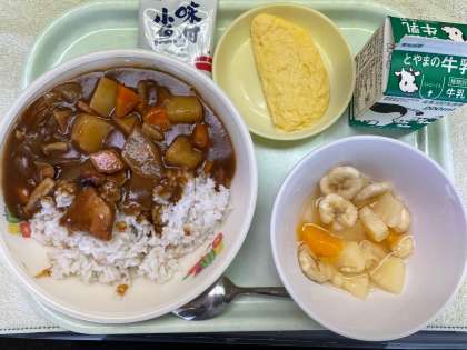 【献 立】 麦ご飯、牛乳 たべキリンハヤシ オムレツ フルーツポンチ 味付け小魚