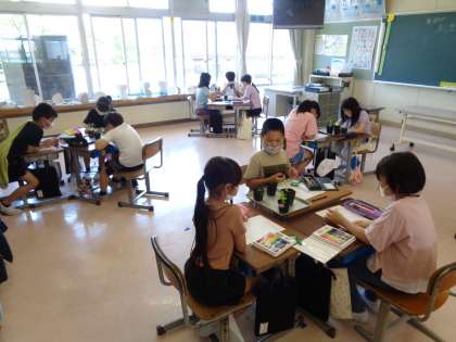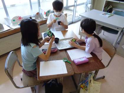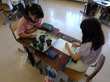5月にまいたたねが芽を出して、すくすくと成長しています。「葉の数が増えたよ」「葉の形が全然違うよ」と新しい発見がたくさんあって、真剣に観察していました。これからどのように成長していくか、楽しみですね。