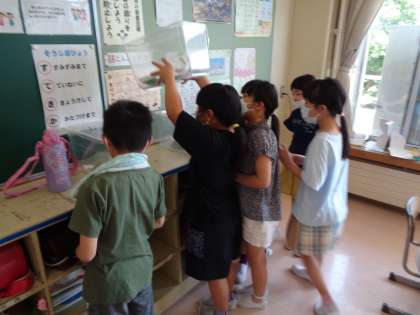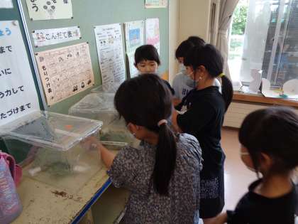理科では、今日からちょうの学習が始まりました。モンシロチョウのたまごと幼虫を育てています。どんな身体をしているのか、どこにいるのか、興味津々で観察していました。これから一生懸命お世話をして、育ってくれるといいですね。