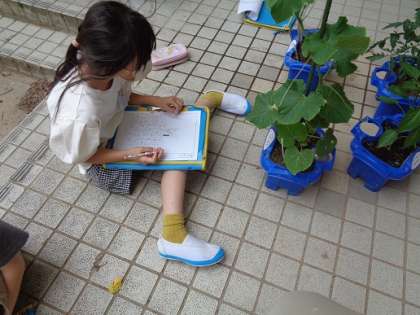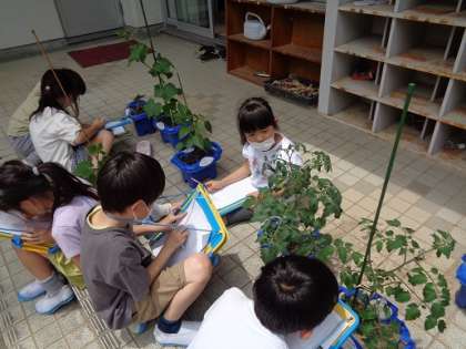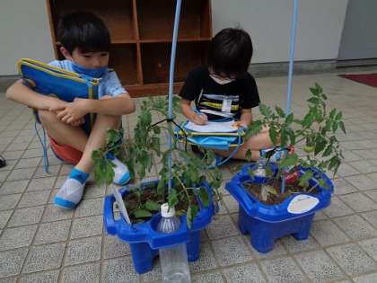 野菜の観察をしました。以前植えたときの野菜の様子と比べ、「実が出てきている」、「背が高くなっている」と自分の育てている野菜たちがすくすくと育っていることを喜んでいました。