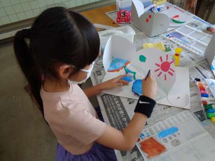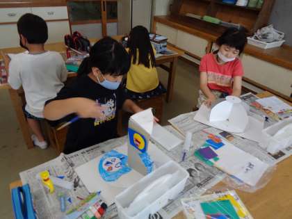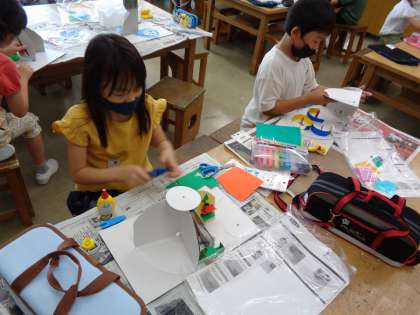 先週から取り組んでいるくるくるランドの制作の様子です。今回は家から必要な材料を持ってきて工夫していたり、絵の具を使って表現したりしている様子がみられました。完成まであと少しですね。
