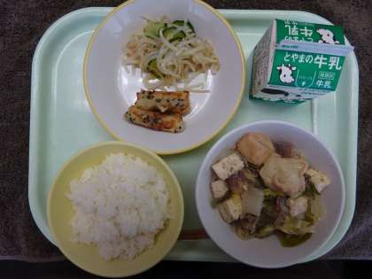 【献 立】 ごはん、牛乳 ちくわの南部揚げ 甘酢和え すきやき