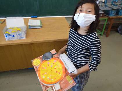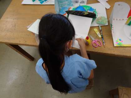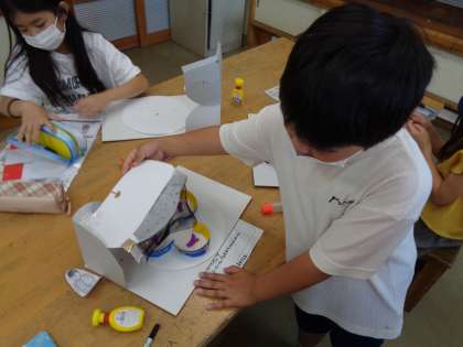 図工で取り組んできたくるくるランドの作品が完成しました。材料や色の組合せを工夫して、個性豊かな作品に仕上がりました。