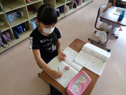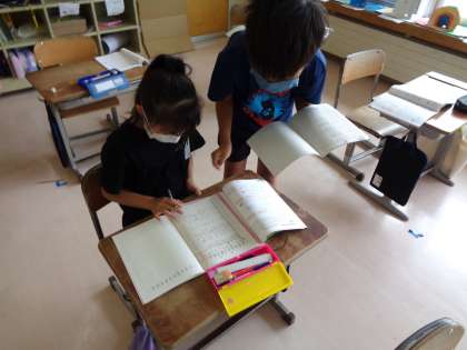 算数では、大きい数の筆算について学習しています。位をそろえて書くことや、くり上がり、くり下がりに気をつけて計算しています。友達同士で教え合ったり、黙々と問題に取り組んだりと、計算が早く正確にできるように学習する子供たちでした。