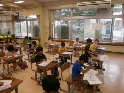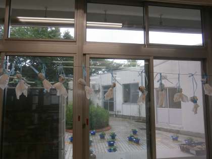 「校外学習の日、晴れるといいな。」と、てるてるぼうずを作りました。ひらがなの練習もてるてるぼうずが見守ってくれています。