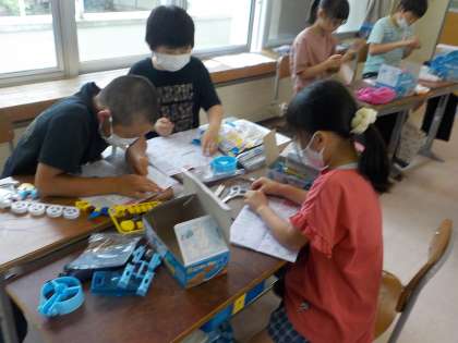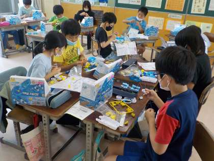 今日は、プロペラカーづくりをしました。導線をつないだり、スイッチを組み立てたりするのは、難しかったのですが、友達同士助け合いながらつくっていました。