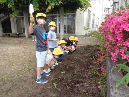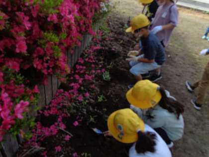今日は、4月から育てている植物を広い場所に植え替えました。優しくポットから取り出し、丁寧に植えました。フラワーロードが完成するのが楽しみですね。