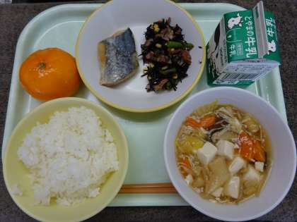 【献 立】 ごはん、牛乳 鰆の西京焼き ひじきのソテー 豆腐の野菜あんかけ 冷凍みかん