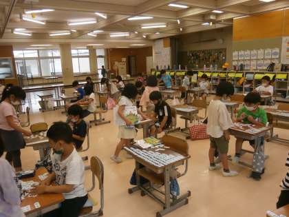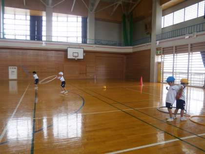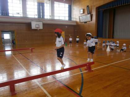 体育は「バランスサーキット」で平均台を渡ったり、ペアと息を合わせてボールを運んだりします。算数は、足し算カードを並べて、式や答えの並び方の秘密を探します。楽しく学習しています。
