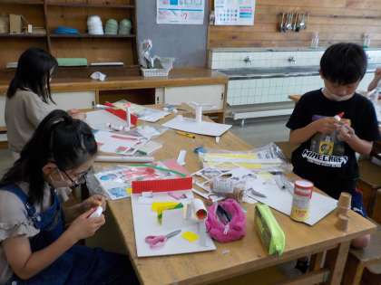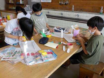 自分で持ってきた材料も使い、ビー玉が転がるコースを工夫してつくっています。「長いコースができたよ。」「カーブさせるとおもしろい。」とアイディアを出し合いながら、楽しく活動しました。