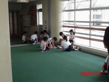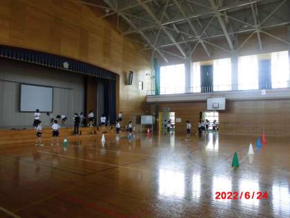 今日の体育はフラッグフットボールを行いました。チームごとに作戦を練っていました。猛暑日ということで、作戦タイムは体育館前廊下