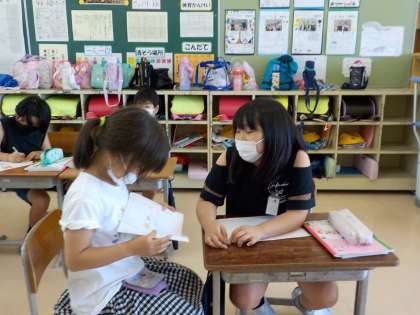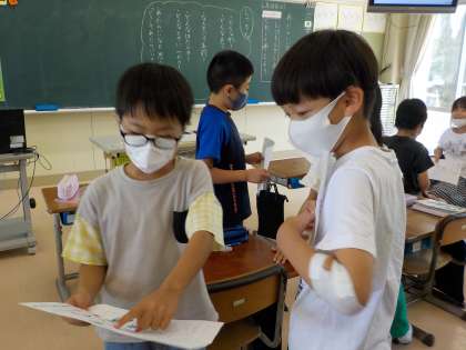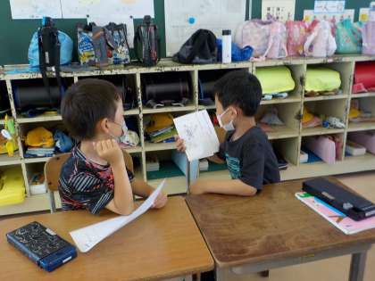 「あったらいいな、こんなもの」の学習の様子です。ペアで質問し合い、あったらいいなと思う物をより詳しく考えました。質問し合うことで、考えた物が、より詳しくなりました。質問し合うことのよさを感じていた子供たちです。