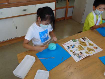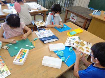 図工の時間に、粘土を使いながら思いついたものをつくる活動をしました。手で形をつくるだけではなく、粘土ベラやたこ糸を使って様々な形を作り出しました。用具を使うことで、手だけでは表せない形ができるのを楽しむ子供たちでした。