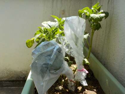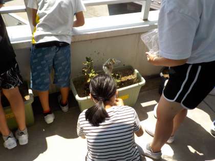 「葉から水蒸気になって出て行く」と予想した子が多かったので、葉を付けたままのジャガイモと、葉を取ったジャガイモに袋をかぶせ、どうなるか実験しました。