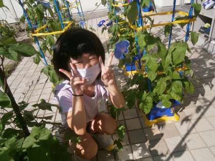 毎朝の楽しみがまた増えました。あさがおの花を見ることです。青や紫のきれいな花がたくさん咲くようになりました。「今日はいくつ咲いたかな。」と水やりとともに数を数えます。朝の準備も自然と早く済ませるようになりました。