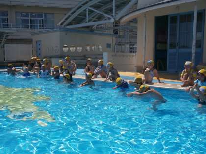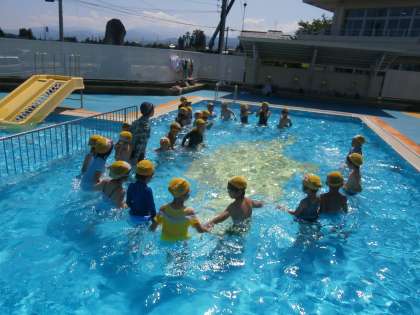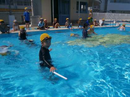 今日も元気にプール学習をしました。みんなで輪になってカレー作りです。「にんじん切って、じゃがいも切って」と水しぶきを上げながら水をバシャバシャとたたいて楽しみました。ロケットにも挑戦しました。宝探しでは、沈んでいる宝物を潜って拾いました。今は潜れない人も、一生懸命腕を伸ばして、少しずつ顔を水に近づけられるように頑張っていました。