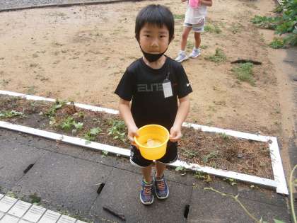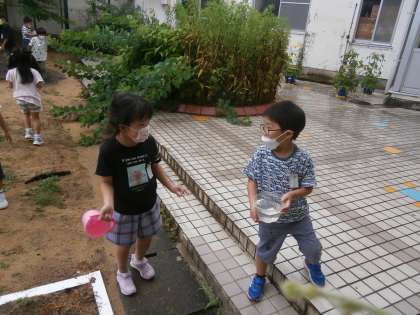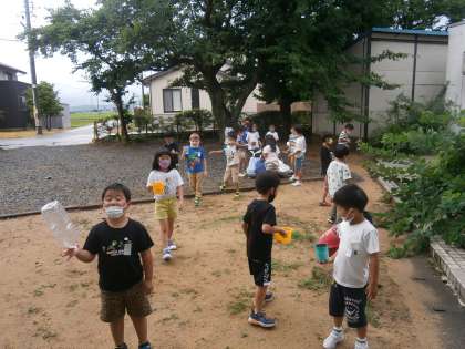 「雨も楽しいね!」とバケツやカップを置いて、雨水をためたり雫の音を聞いたりしました。「水のにおいだ。」「ちょっとべたべたする。」「でも雨が降ると虹が出るよ。」とみんなで雨について話しました。