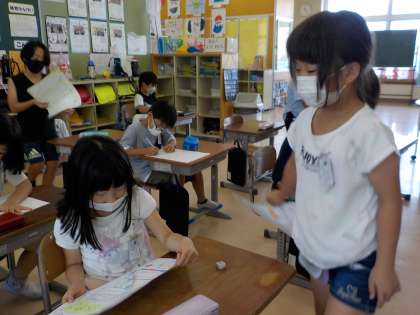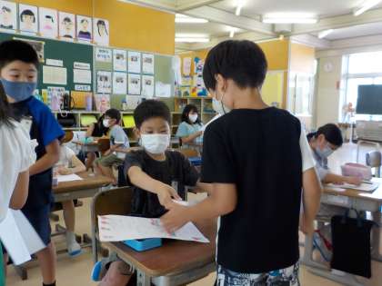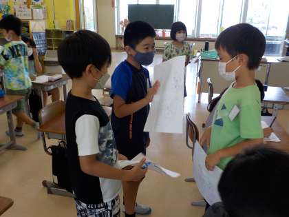 野菜の成長をまとめた野菜新聞を作り、互いに読み合いました。友達の作った新聞の内容やまとめ方について、コメント書きました。新聞にまとめられている友達の嬉しかったことや苦労話に目を向けていました。嬉しそうにコメントを送り合っていた子供たちです。