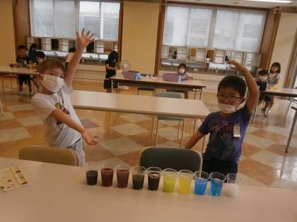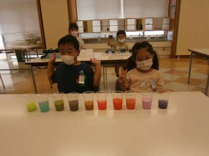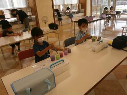 水彩絵の具を透明カップで水に溶かして、いろいろな色を楽しみました。単色で作ったり、色を混ぜたりそれぞれに工夫をしながら、友達のカップと一緒に並べていました。